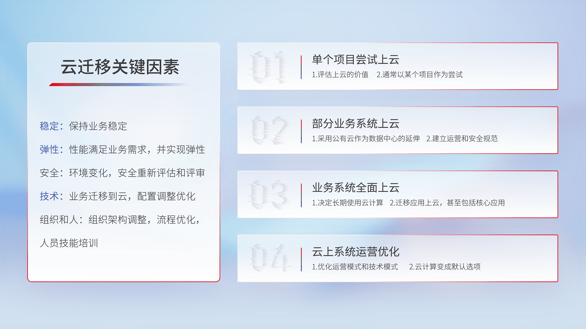结合实际业务,,,,从规划设计、、、云平台选型、、云原生改造、、数据迁移、、集成交付,,,,迁移全过程为客户识别最佳上云路径,,做好风险识别管理,,,,设计网络架构、、、、身份权限、、、、安全审计合规、、、、操作审计、、、、日志审计、、监控告警策略、、、、多站点容灾设计等,,,,对云上基础设施进行整体规划,,,,提升IT治理水平,,以满足弹性、、、高可用、、、高性能的需求。。。